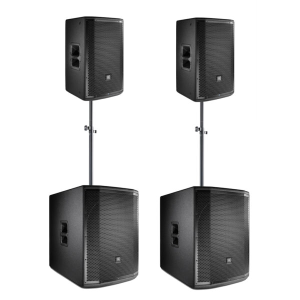 JBL PRX712 Geluidset 3 actief bestaat uit 2 JBL PRX 718 XLFW subwoofers met daarop 2 JBL PRX 712 top speakers op tussenpaal. De hoogte is instelbaar van de tussenpaal. Een complete geluidset set inclusief bekabeling die zich gemakkelijk laat opzetten in enkele minuten. De JBL geluidset levert indrukwekkende prestaties zowel op laag als hoge frequenties en een geluidsdruk van 136 db! De JBL geluidset vult ruimtes van 75 tot 125 personen. Het is ook mogelijk om deze JBL geluidset als monitor set in te zetten voor bijvoorbeeld een DJ. De JBL geluidset is een actieve set, dat houd in dat de versterker ingebouwd is in de speaker en er geen losse versterkers nodig zijn.