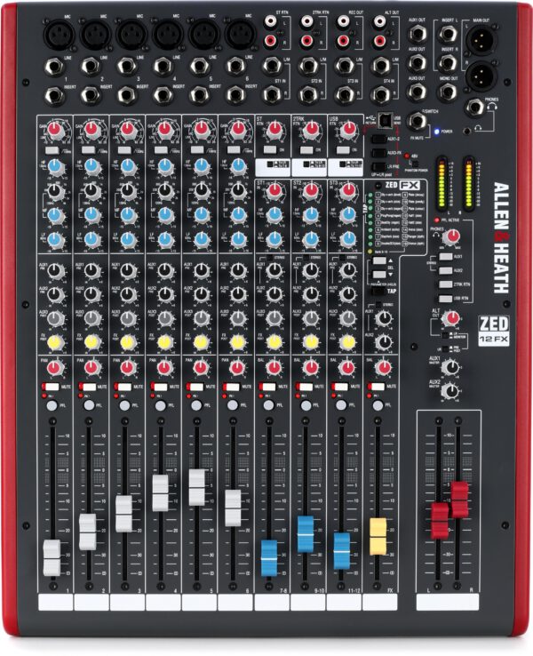 Allen & Heath ZED12FX, deze mixer bevat 6 mono en 3 duale stereo kanalen. De FX sectie van de mixer is in 4 verschillende typen te verdelen: tap tempo delays, short reverbs, long reverbs en modulatie. Bediening en instelling hiervan geschiedt via drie eenvoudige knoppen.