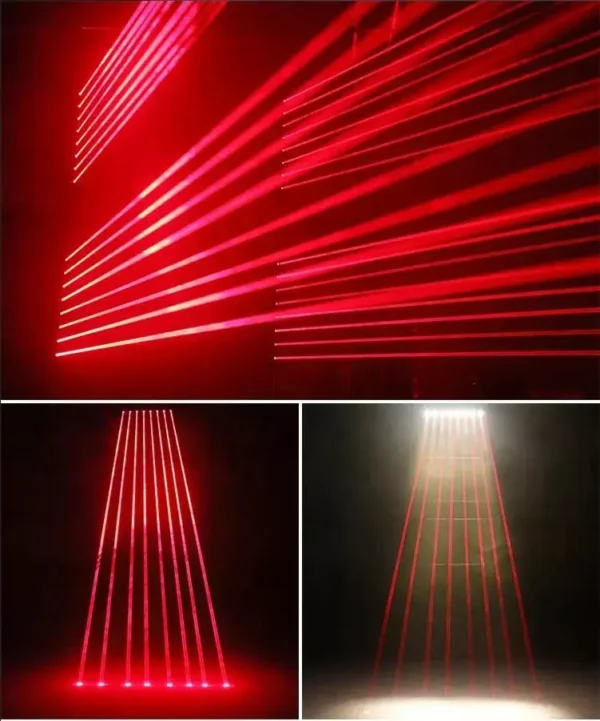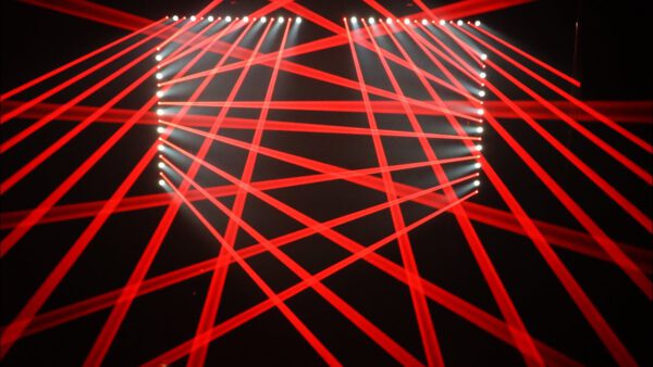 De MOVING LASER BEAM BAR heeft 8x laser Red: 500mW (638nm) en 8x 3W CREE Warm White led