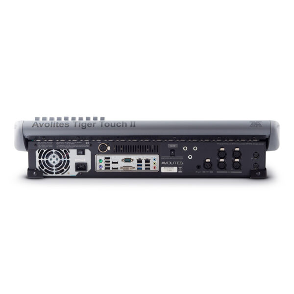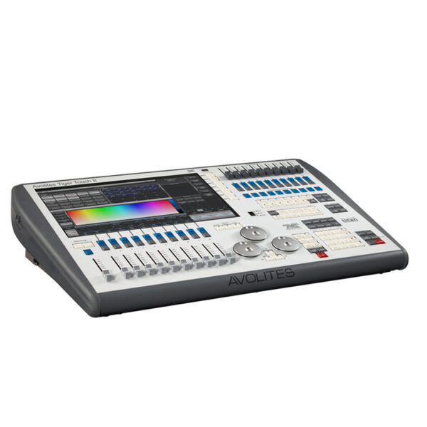 Direct onder het touchscreen is de welbekende ‘playback’ sectie geplaatst bestaande uit 10 faders met add/flash en swap/solo knoppen. Direct daarnaast vindt u drie draaiwielen voor het gemakkelijk positioneren van bewegend licht. De rechterkant van de console is volledig in de stijl van de welbekende Avolites Pearl ingericht. Wie ooit met een Pearl gewerkt heeft kan dus ook prima overweg met de Tiger Touch. Met 2 full speed artnet universes en 4 DMX 512 uitgangen heeft u voldoende outputs om een volwassen lichtshow aan te sturen.