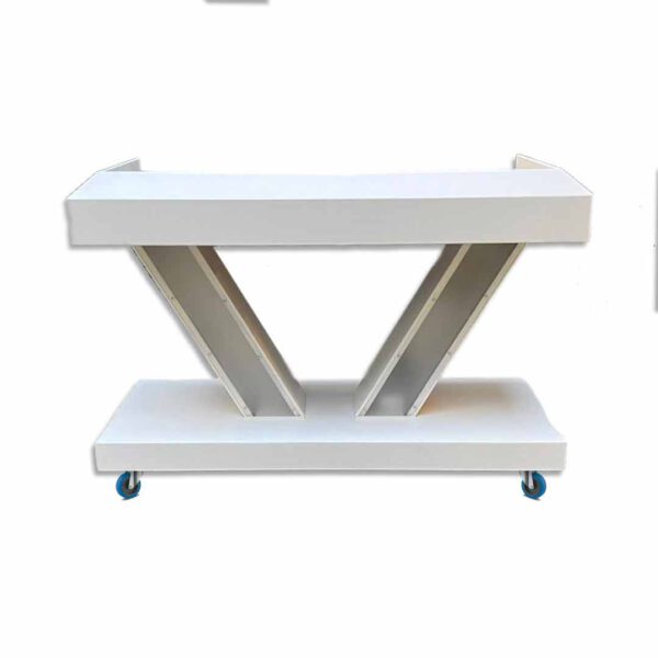 DJ Booth V wit is een professionele presentatie- en DJ-booth met een open design in een V-vorm met geïntegreerde led verlichting. Het hoofdplateau bied voldoende ruimte voor diverse DJ gear en DJ controllers, er passen 3x Pioneer CDJ 3000 en een Pioneer DJM-A9 op. Apparatuur en kabels zijn zo goed als niet zichtbaar voor publiek, wel zo netjes! De looks van het geheel ziet er gewoon enorm stevig en stoer uit, met name de opvallende V-vorm met geïntegreerde led verlichting. DJ Booth V wit staat op wieltjes en daarmee eenvoudig te verplaatsen. Een patchpaneel met weggewerkte bekabeling aan de binnenzijde zorgt voor aansluitgemak en een strak kabelmanagement.